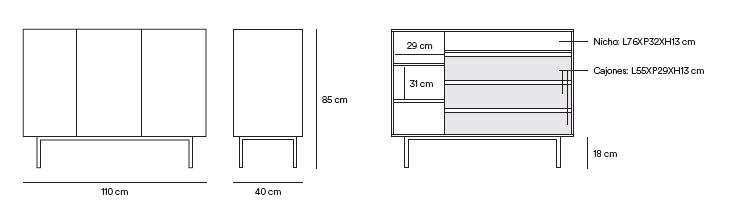 El aparador ARISTA consta tres puertas segun medida elegida, tras las que encontramos en su interior dos baldas y tres cajones, ofreciendo un amplio espacio de almacenamiento. REQUIERE MONTAJE (Se facilita instrucciones y llave de montaje).