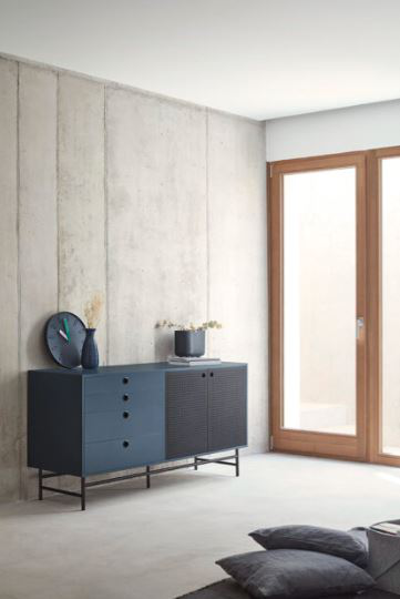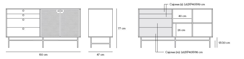 El aparador Punto consta de dos puertas y cuatro cajones. En el interior encontramos dos baldas, complementando así el amplio espacio de almacenamiento. REQUIERE MONTAJE