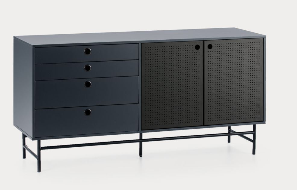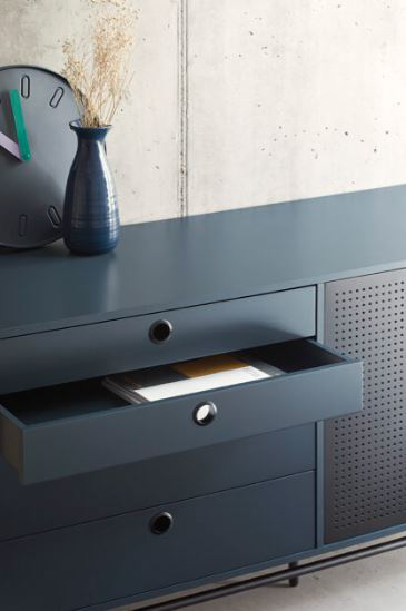 El aparador Punto consta de dos puertas y cuatro cajones. En el interior encontramos dos baldas, complementando así el amplio espacio de almacenamiento del mueble.La colección presenta puertas metálicas perforadas con tirador circular integrado, seña distintiva de la colección. El casco lacado en colores blanco, verde oscuro y azul grisáceo antracita. Los cajones poseen raíles con auto cierre, lo que asegura un cierre automático suave y silencioso. Incorpora una pata de apoyo regulable para un ajuste a la perfección ante cualquier desnivel del suelo. REQUIERE MONTAJE (Se facilita instrucciones y llave de montaje).