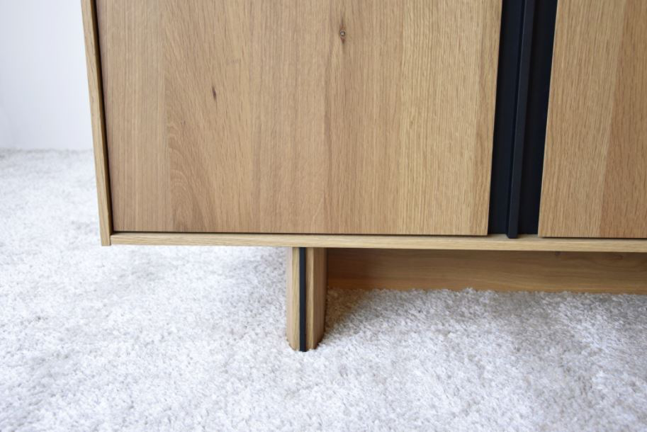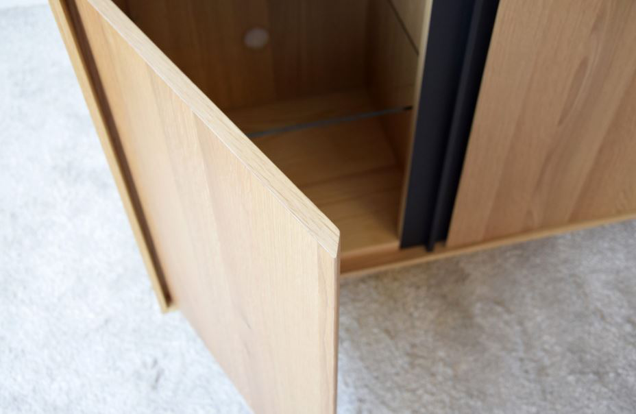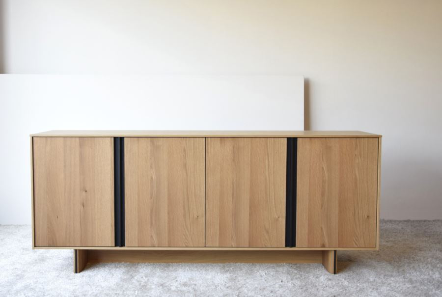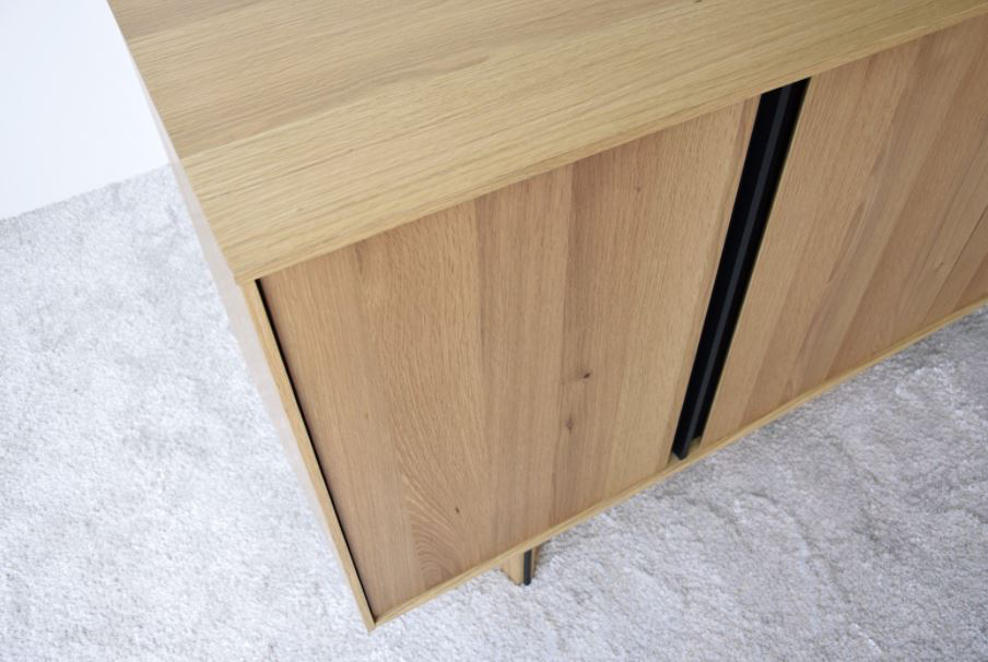 APARADOR REALIZADO EN DM RECHAPADO EN MADERA DE ROBLE CON ACABADO NATURAL MATE. EL RECHAPADO DE MADERA NATURAL DE ROBLE SE HACE DE FORMA ARTESANAL BUSCANDO UNA COMBINACIÓN DE PIEZAS QUE HACE QUE EL MUEBLE RESPIRE UN CARACTER NATURAL A TRAVÉS DE LAS DISTINTAS VETAS Y COLORES PROPIAS DEL MATERIA. DETALLES EN METAL NEGRO ACABADO MATE EN TIRADORES Y PATAS. CUATRO PUERTAS.INCLUYE BALDAS INTERIORES DE VIDRIO TEMPLADO.
