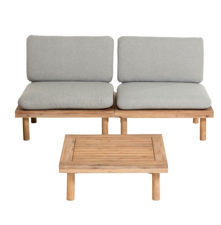 Madera maciza de acacia tratada con lacado PU para larga durabilidad y resistencia a los rayos UV. Estructura adaptable a cualquier espacio, gracias a la posibilidad de distintas combinaciones. Respaldos de aluminio y protecciones regulables de plástico en las patas para proteger el suelo y corregir en caso de desnivel. Cojines grises incluidos desenfundables e impermeables, aptos para la lavadora. Set con un diseño y materiales preparado para interiores y exteriores bajo techo