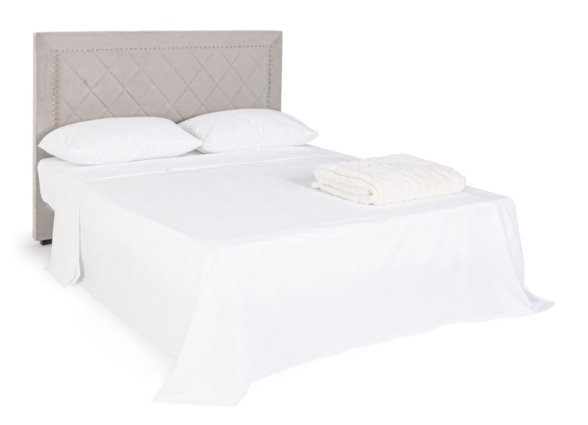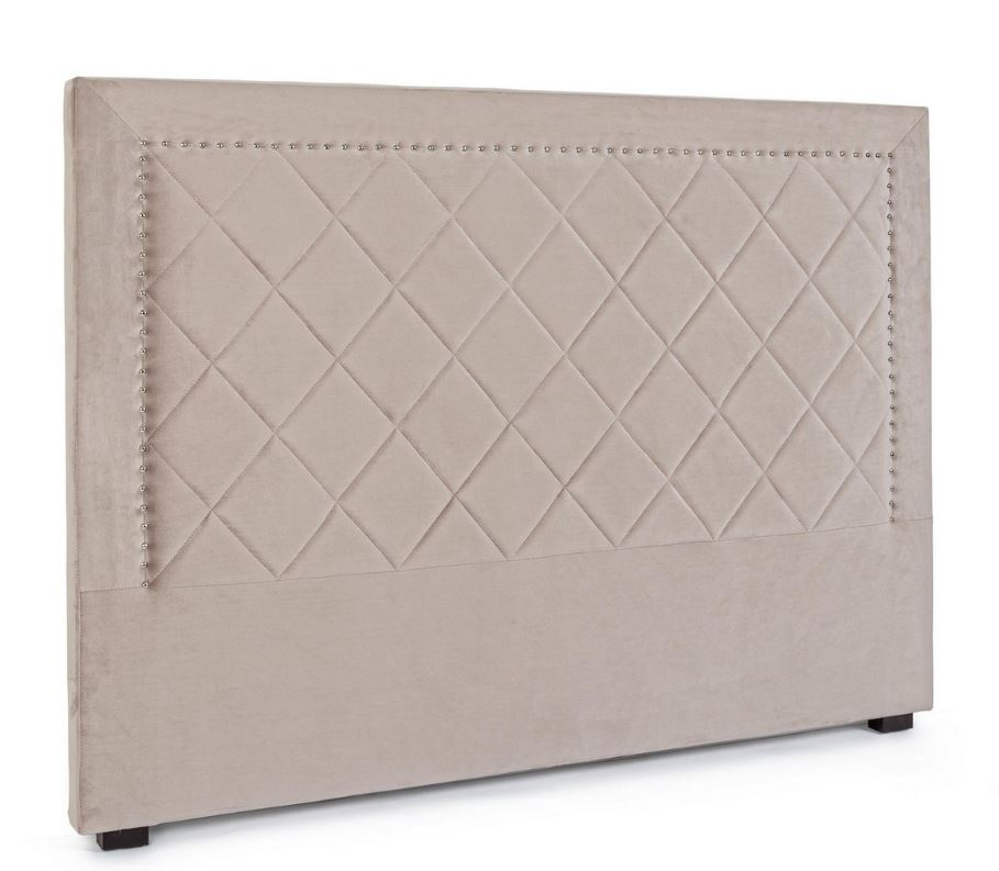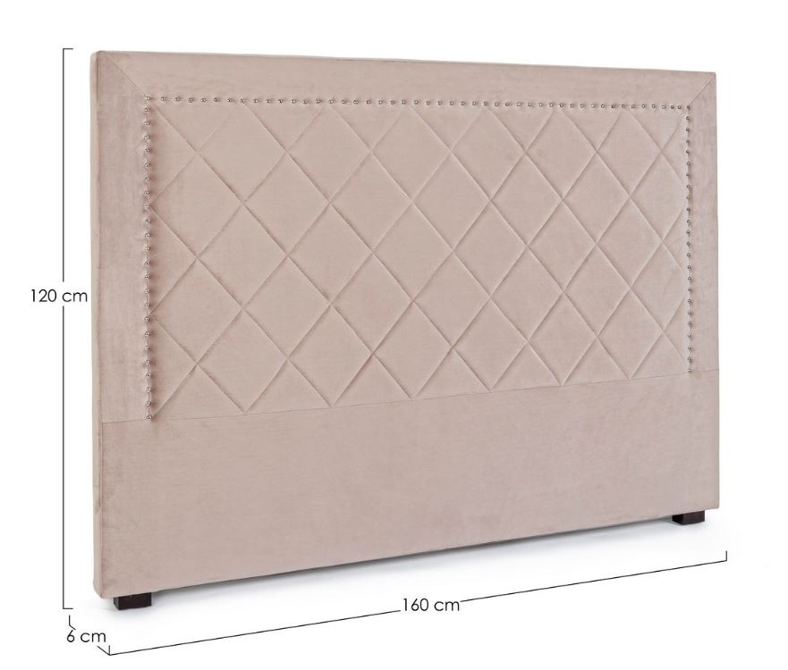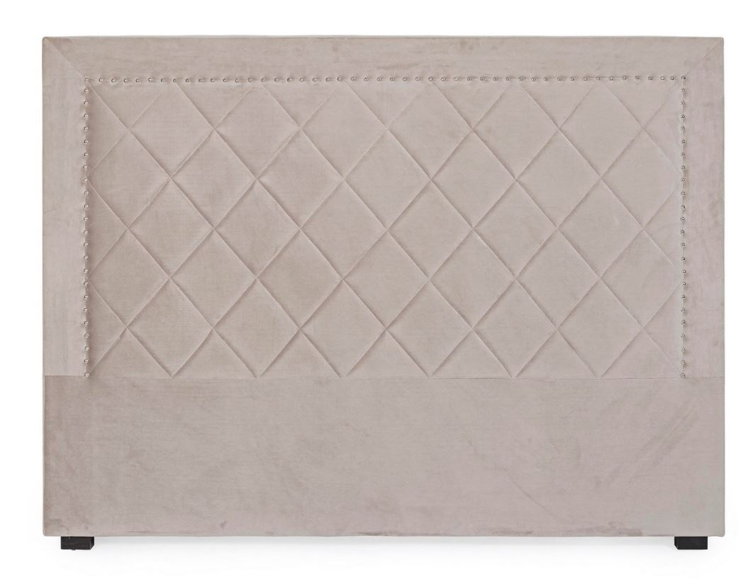 Estructura de contrachapado. Revestimiento no desenfundable de poliéster con aplicación de tachuelas metálicas. Relleno de espuma de poliuretano. Patas de madera de pino.