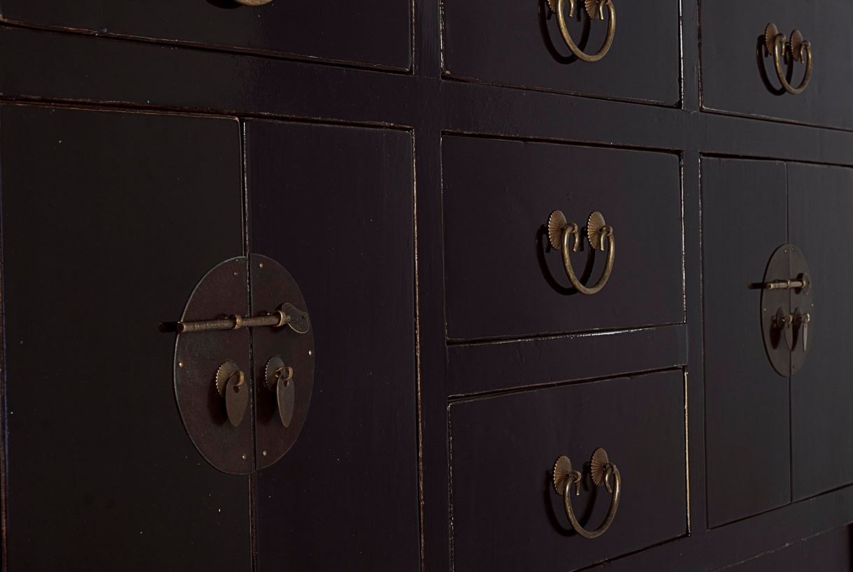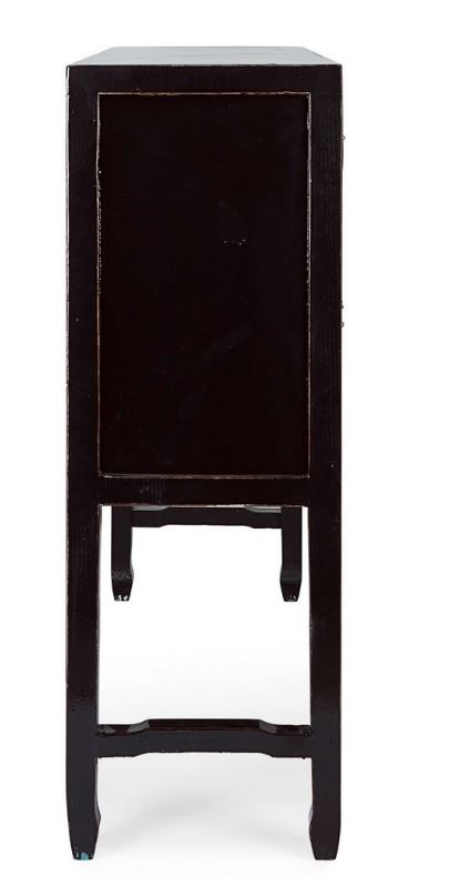 Estructura de madera de olmo reciclado. Respaldo y paneles interiores de contrachapado. Acabado brillo patinado a base de agua. Tiradores de cobre.