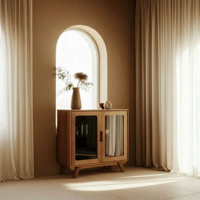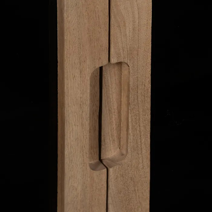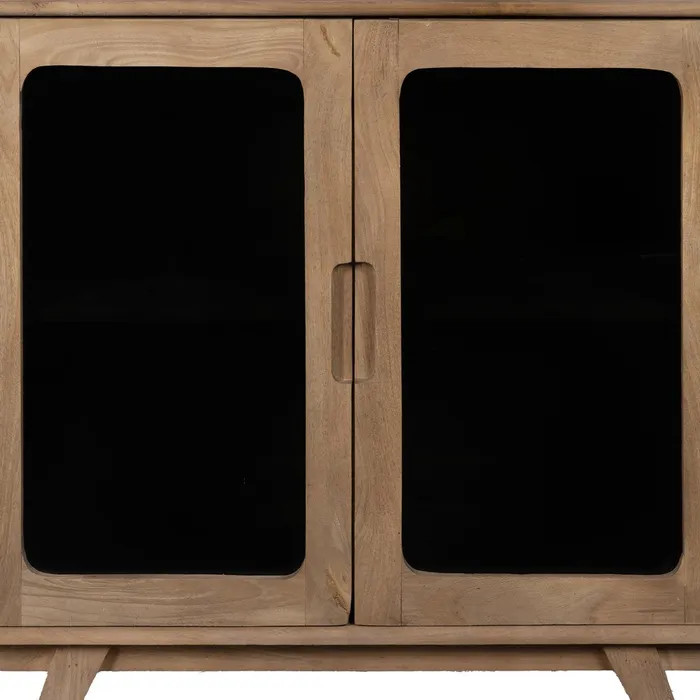 Con medidas de 81 x 41 x 83 cm, se adapta fácilmente a cualquier rincón del salón, el recibidor o incluso un dormitorio. Sus puertas de cristal (39 x 64 cm) permiten lucir tus piezas favoritas con elegancia, mientras que las patas de 15 cm le aportan ligereza y modernidad. La madera de mango, con sus vetas únicas y tonos cálidos, convierte cada unidad en una pieza irrepetible.