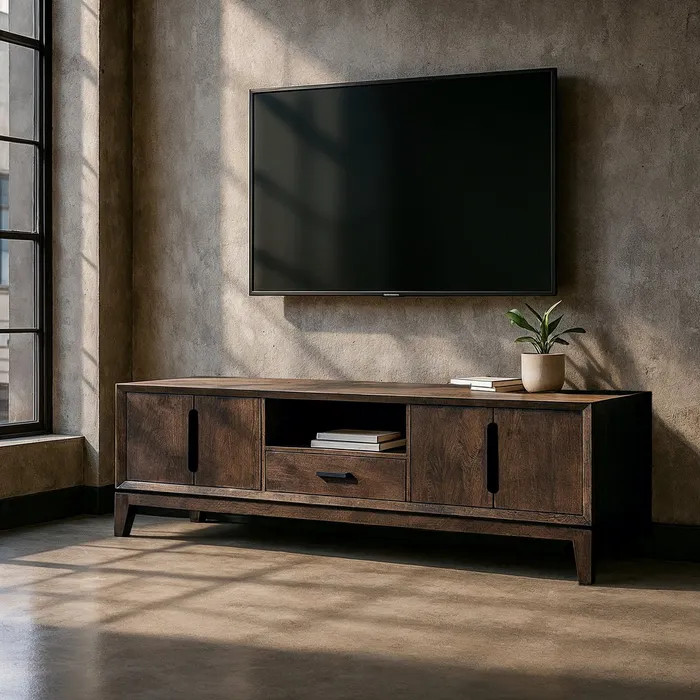 Dale a tu salón un toque de elegancia y funcionalidad con este mueble TV de madera de mango en cálido tono marrón.