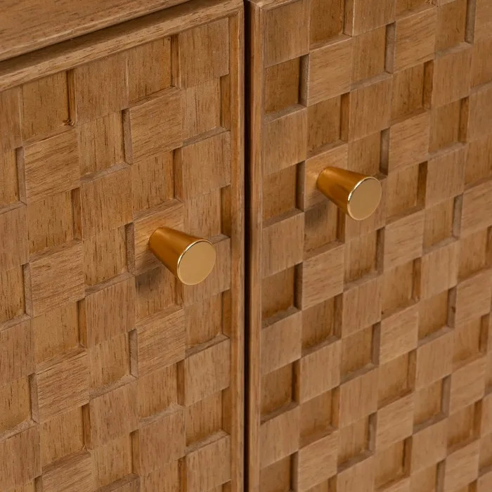 Las puertas, decoradas con pequeños cubos, ofrecen un diseño original que añade textura y dinamismo visual. Fabricada en DM, metal y vinilo con acabado en madera de fresno, esta vitrina destaca por su estética sofisticada. Las puertas superiores de 42 x 118 cm y las inferiores de 42 x 61 cm dan acceso a un interior bien distribuido, con huecos de distintas alturas (38,5 - 38,5 - 40 cm en la parte superior y 29,5 - 29,5 cm en la inferior), ideales para organizar vajilla, libros o lo que tú decidas mostrar. Una vitrina pensada para quienes valoran el diseño original.