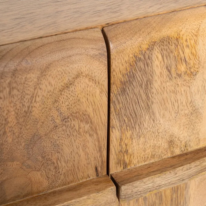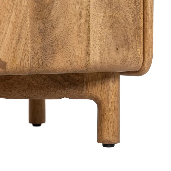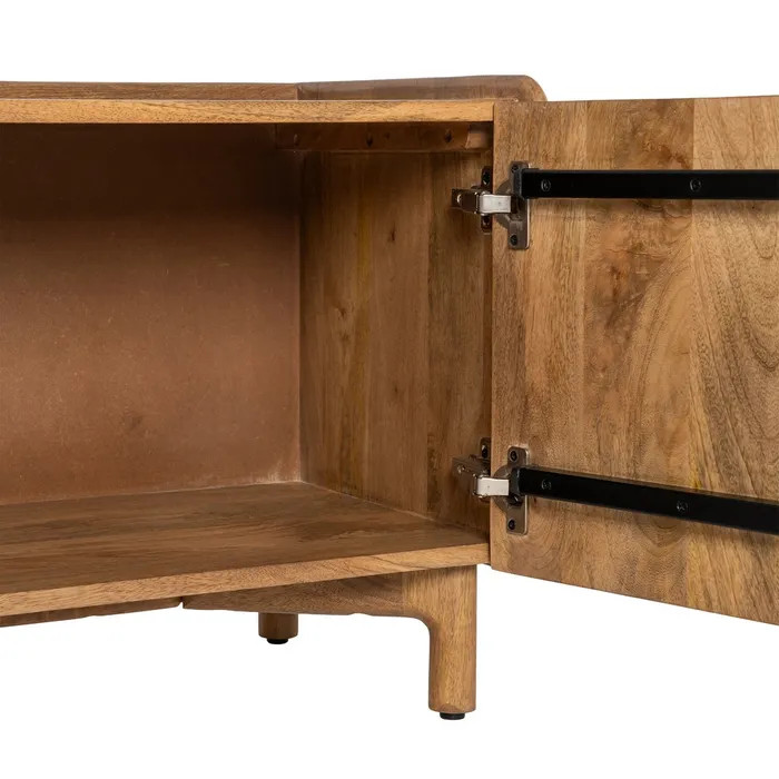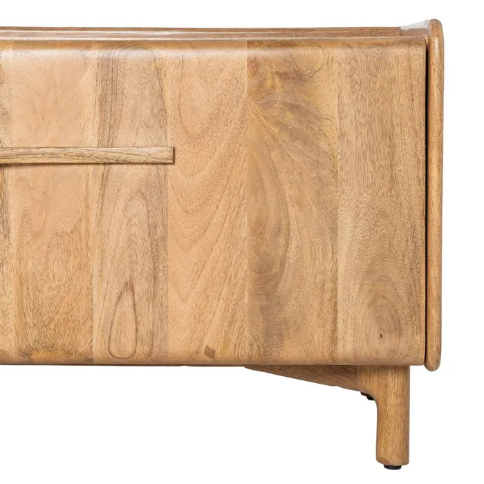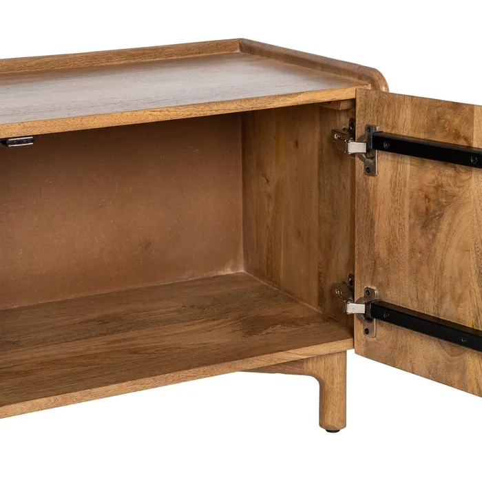 Dale a tu salón un toque cálido y funcional con este mueble TV de madera de mango. Con medidas de 160 x 40 x 50 cm, su diseño natural y elegante se adapta a distintos estilos decorativos. Cuenta con dos puertas de 52 x 35,5 cm que ofrecen espacio para guardar dispositivos, libros o accesorios, y un cajón de 43 x 29,5 cm ideal para mantener el orden. Las patas, de 13,5 cm de altura, requieren montaje y aportan ligereza visual sin perder estabilidad. La madera de mango destaca por su resistencia y vetas únicas, convirtiendo este mueble en una pieza duradera y con personalidad propia.
