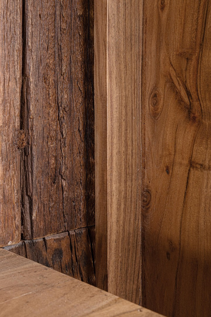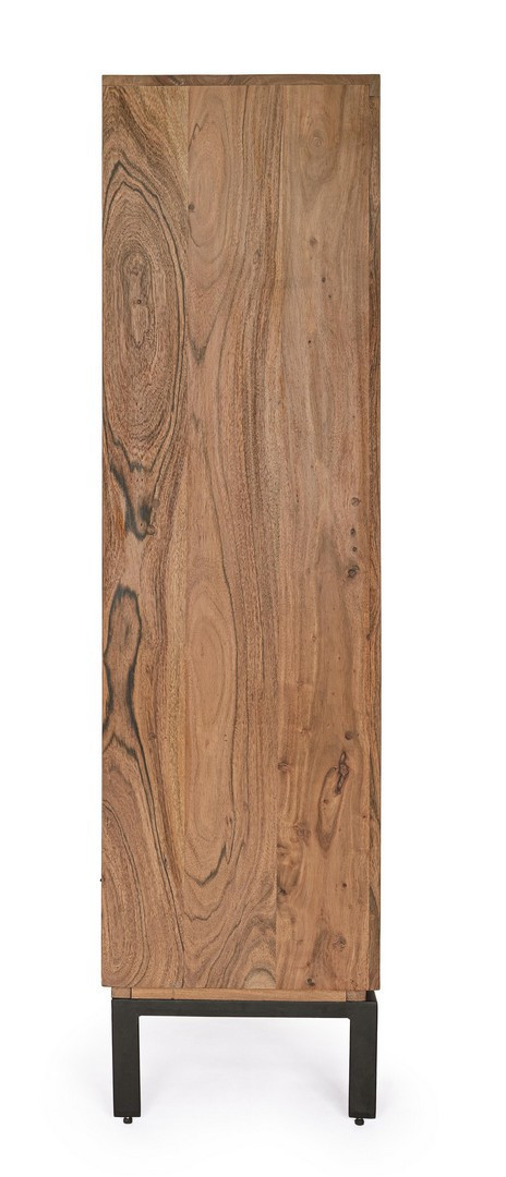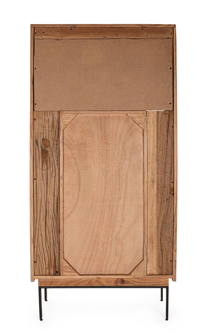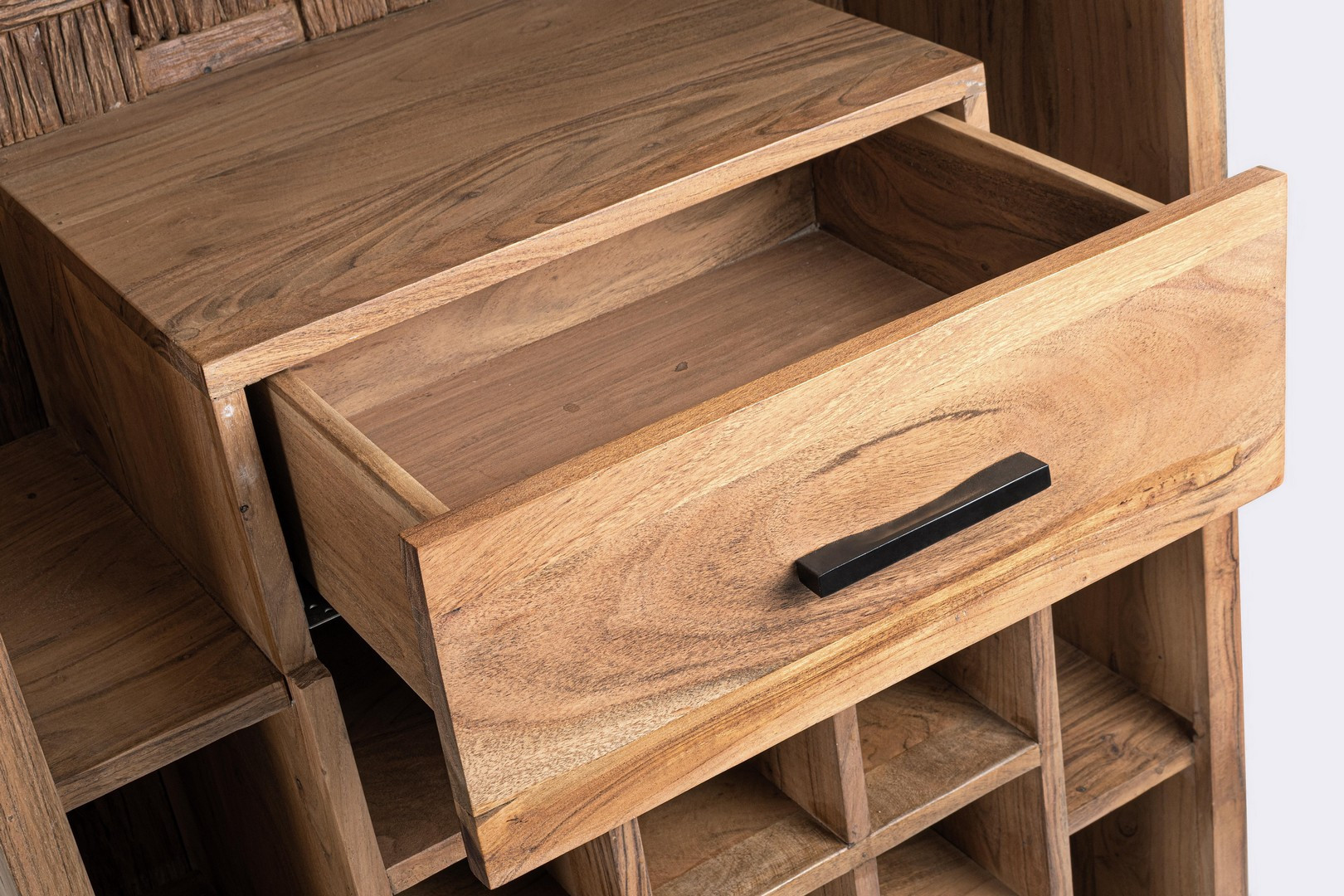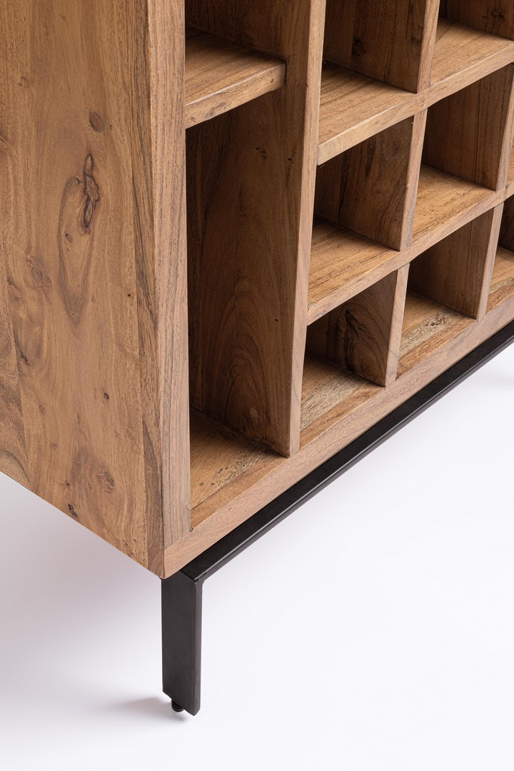 Dale un toque sofisticado a tu hogar con este mueble bar de diseño elegante y funcional. Su estructura de madera de acacia aporta calidez y resistencia, mientras que el dorso en madera contrachapada y el interior visible en madera reciclada reflejan un estilo consciente y sostenible. El acabado acrílico protector realza la textura natural de la madera y garantiza durabilidad. Las puertas con bisagra de cierre suave ofrecen una experiencia silenciosa y refinada. Los tiradores y patas de acero añaden un aire moderno y robusto. Incluye un cajón práctico y luz LED integrada para crear una atmósfera acogedora y destacar tus mejores botellas.