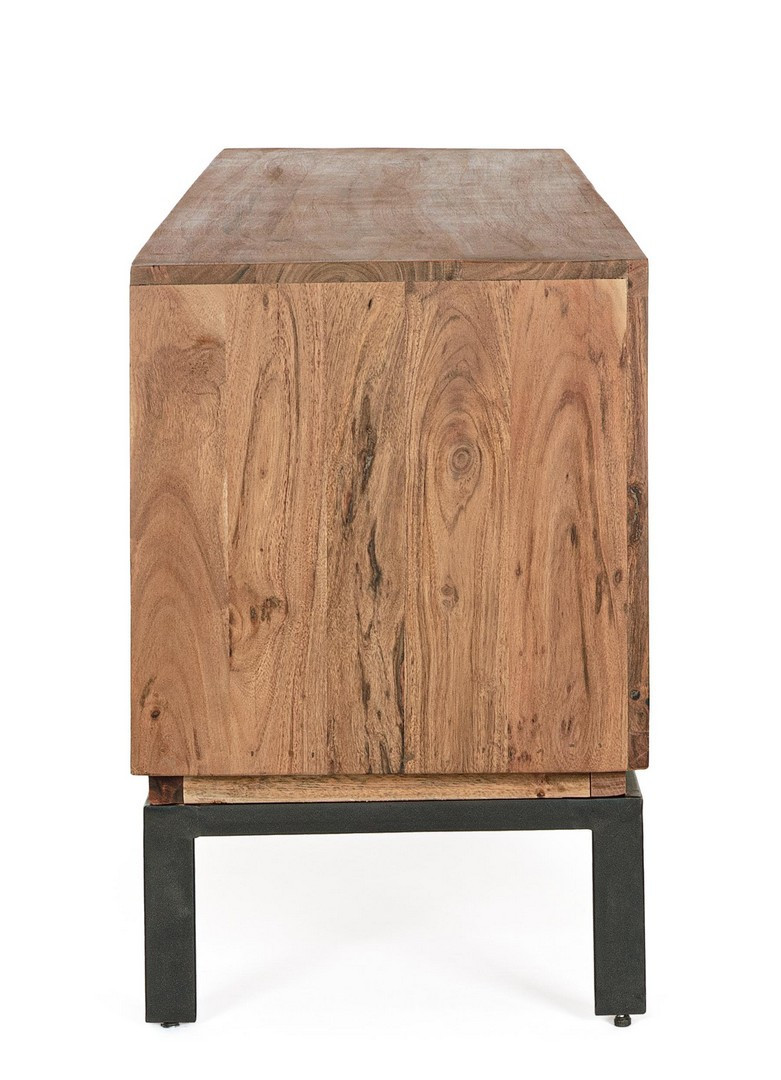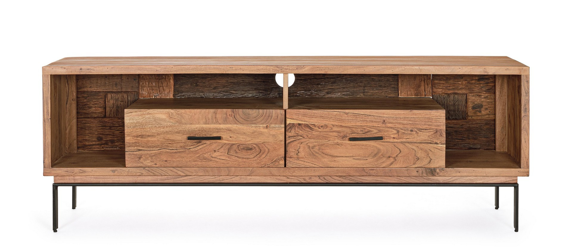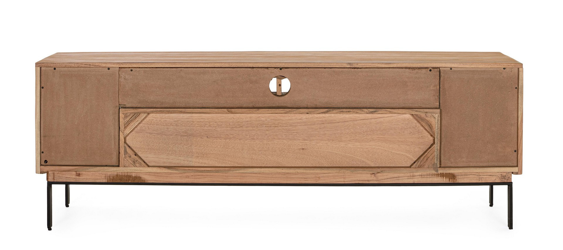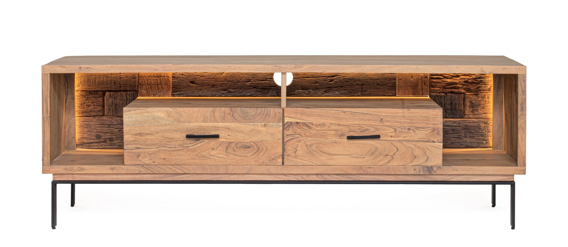 Este mueble para TV combina estilo moderno y materiales de alta calidad para transformar tu sala. Su estructura de madera de acacia aporta calidez y resistencia, mientras que el dorso en madera contrachapada y el interior visible en madera reciclada reflejan un diseño sostenible y auténtico. El acabado acrílico protector realza la textura natural de la madera y garantiza durabilidad. Las puertas con bisagra de cierre suave ofrecen una experiencia silenciosa y elegante. Los tiradores y patas de acero añaden un toque contemporáneo y robusto. La iluminación LED integrada crea una atmósfera acogedora y resalta tus dispositivos con estilo.