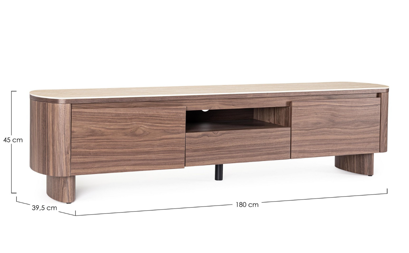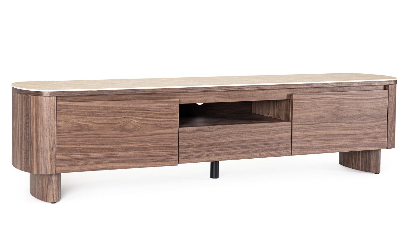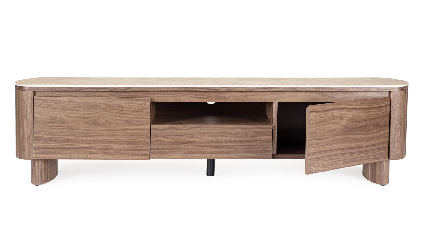 Un mueble de TV pensado para quienes buscan diseño y funcionalidad en una sola pieza. Su estructura y patas de DM chapado en nogal aportan un estilo cálido y elegante, mientras que el tablero de piedra sinterizada con efecto travertino añade un toque sofisticado y resistente al uso diario. Las dos puertas ofrecen espacio de almacenaje discreto y el cajón central permite mantener todo organizado. El acabado en pintura de poliuretano garantiza durabilidad y un aspecto impecable, y las bisagras de cierre suave aportan una experiencia de uso silenciosa y de calidad. Una pieza que eleva cualquier salón.