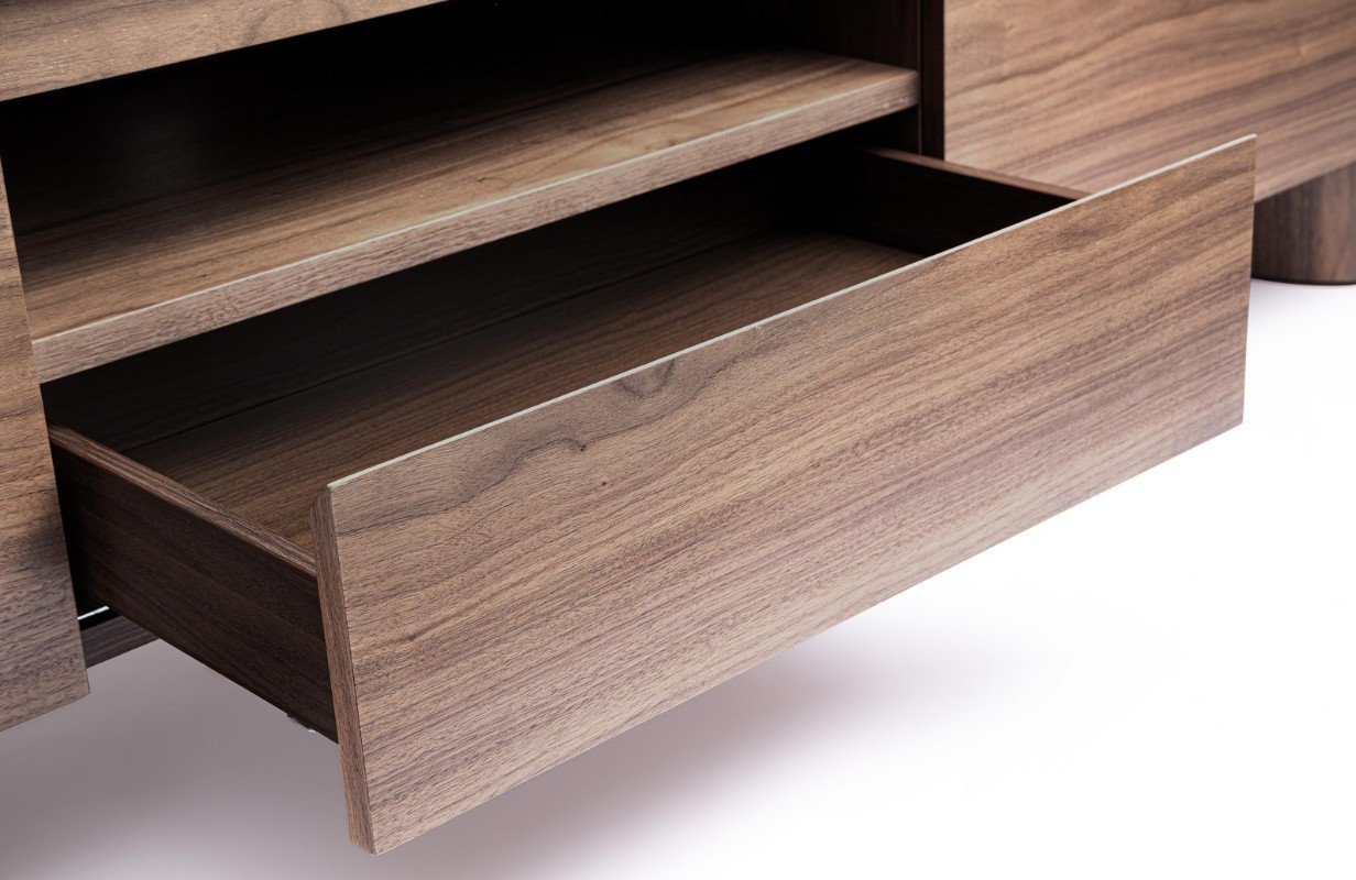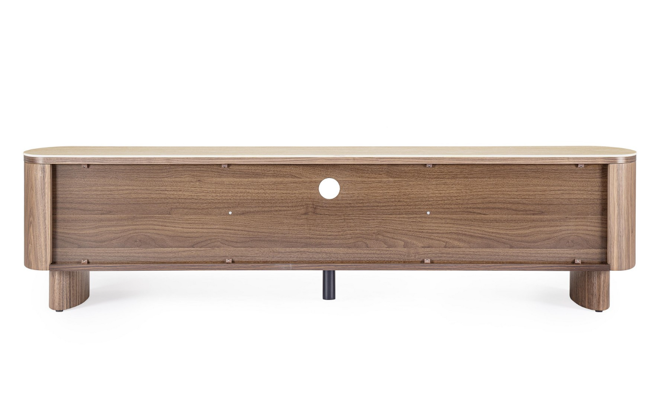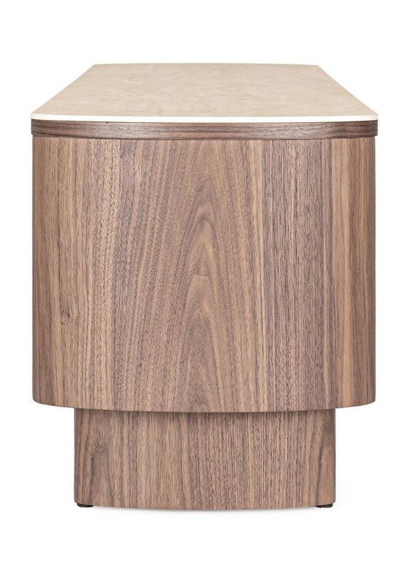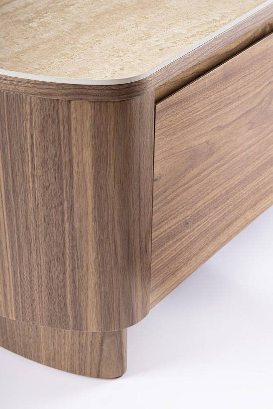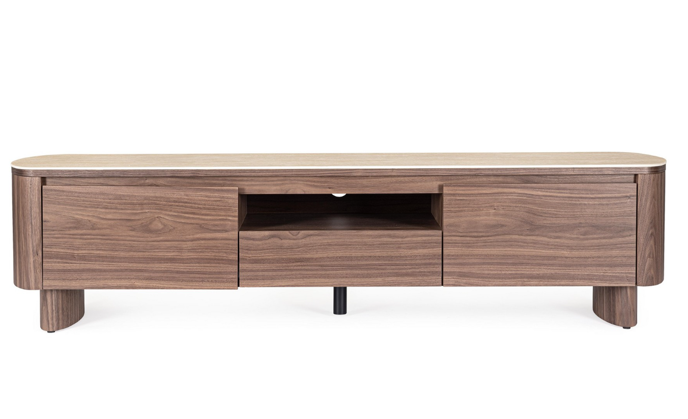 Un mueble de TV pensado para quienes buscan diseño y funcionalidad en una sola pieza. Su estructura y patas de DM chapado en nogal aportan un estilo cálido y elegante, mientras que el tablero de piedra sinterizada con efecto travertino añade un toque sofisticado y resistente al uso diario. Las dos puertas ofrecen espacio de almacenaje discreto y el cajón central permite mantener todo organizado. El acabado en pintura de poliuretano garantiza durabilidad y un aspecto impecable, y las bisagras de cierre suave aportan una experiencia de uso silenciosa y de calidad. Una pieza que eleva cualquier salón.