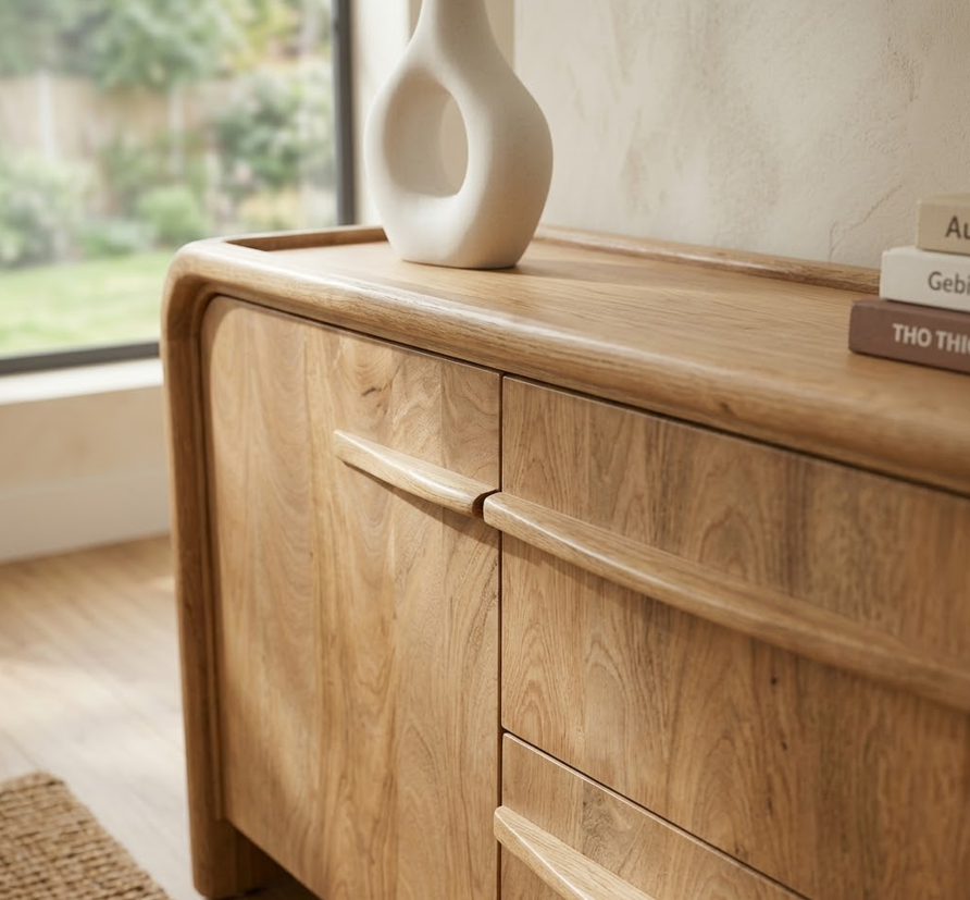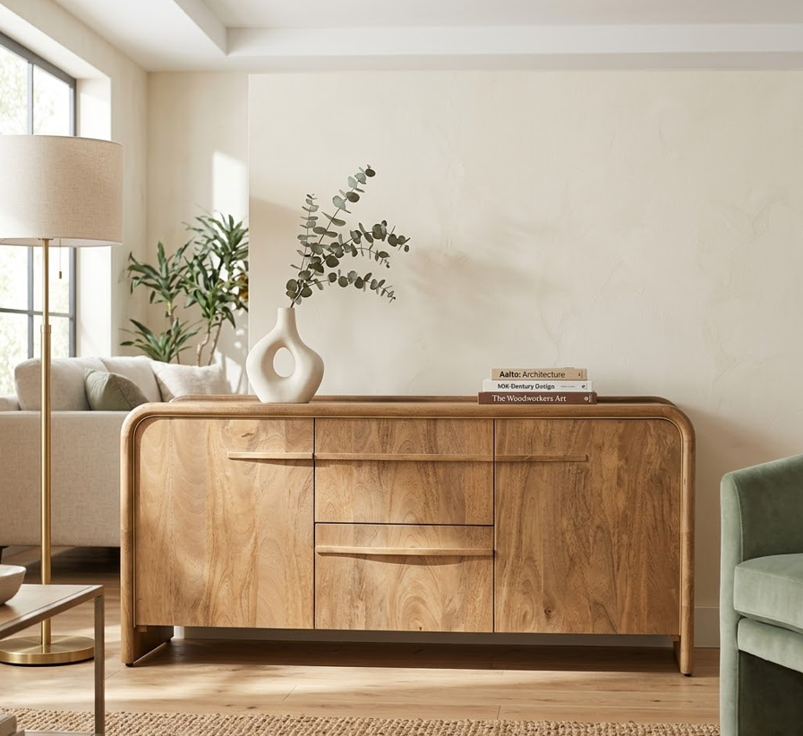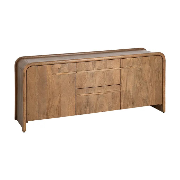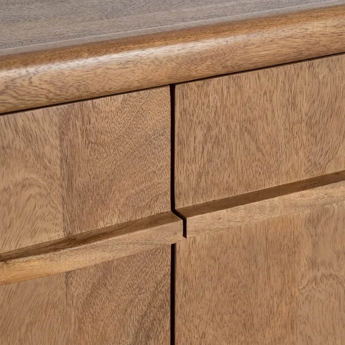Un aparador de madera de mango que transforma cualquier salón en un espacio con carácter. Su diseño de 165 x 45 x 70 cm combina presencia y funcionalidad, ofreciendo una pieza robusta y cálida que destaca por la veta natural de la madera. En el centro incorpora dos cajones amplios para mantener el orden diario, mientras que las dos puertas laterales esconden una práctica balda interior ideal para vajilla, textiles o cualquier objeto que quieras tener a mano pero bien organizado. Es una pieza versátil, elegante y duradera, perfecta para quienes buscan calidad y estilo en un solo mueble.