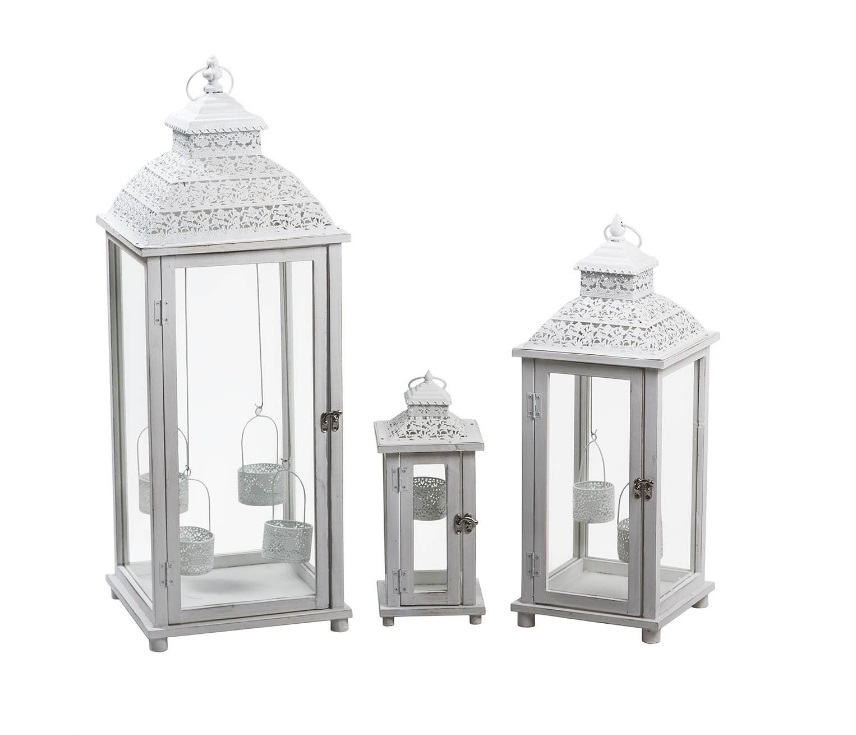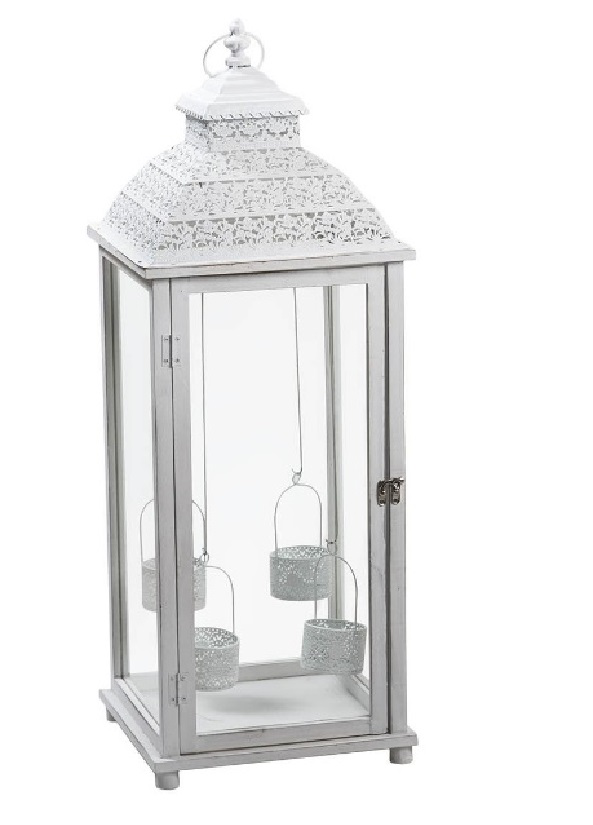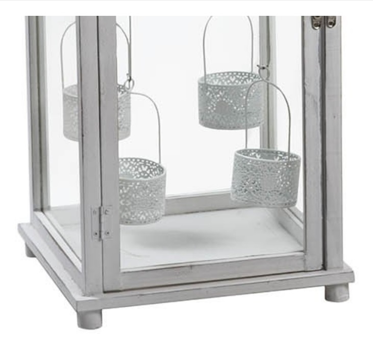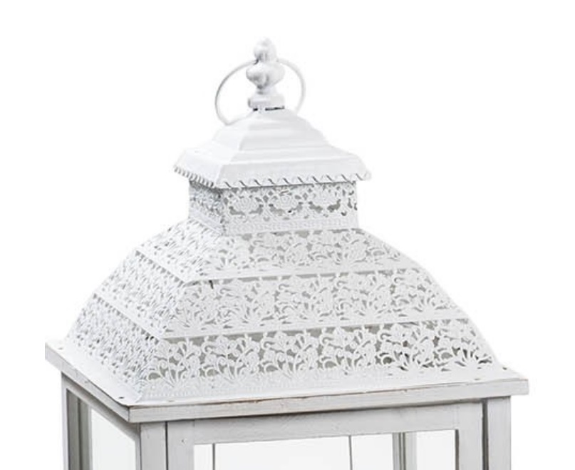 Farol decorativo de madera y cristal adornado con diseño de metal.