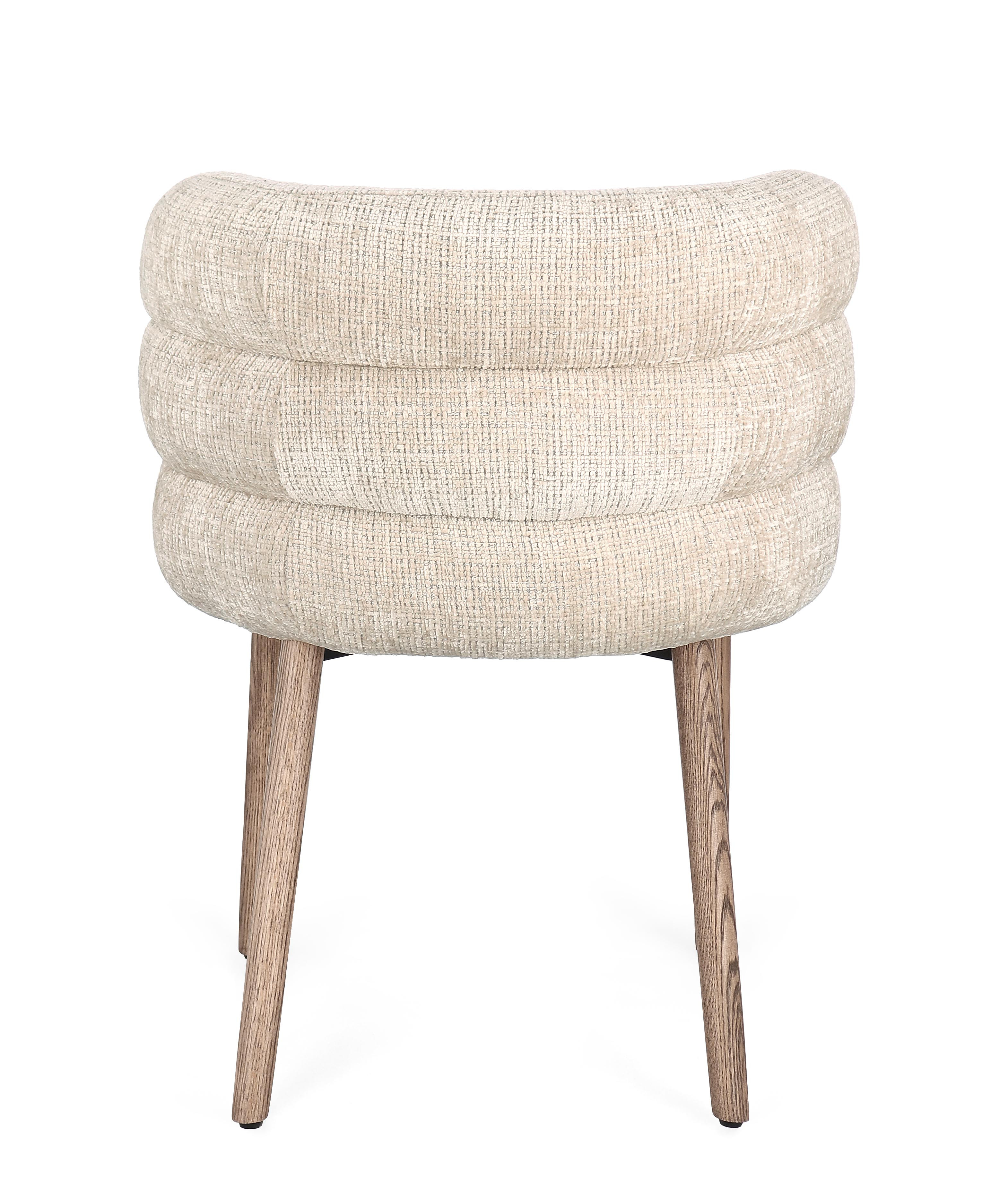 El tapizado en tejido texturizado aporta calidez y carácter, mientras que sus patas de madera maciza estilizan la silueta con un aire natural y atemporal. Una silla pensada para sumar confort y personalidad tanto en un comedor como en un rincón especial del hogar.