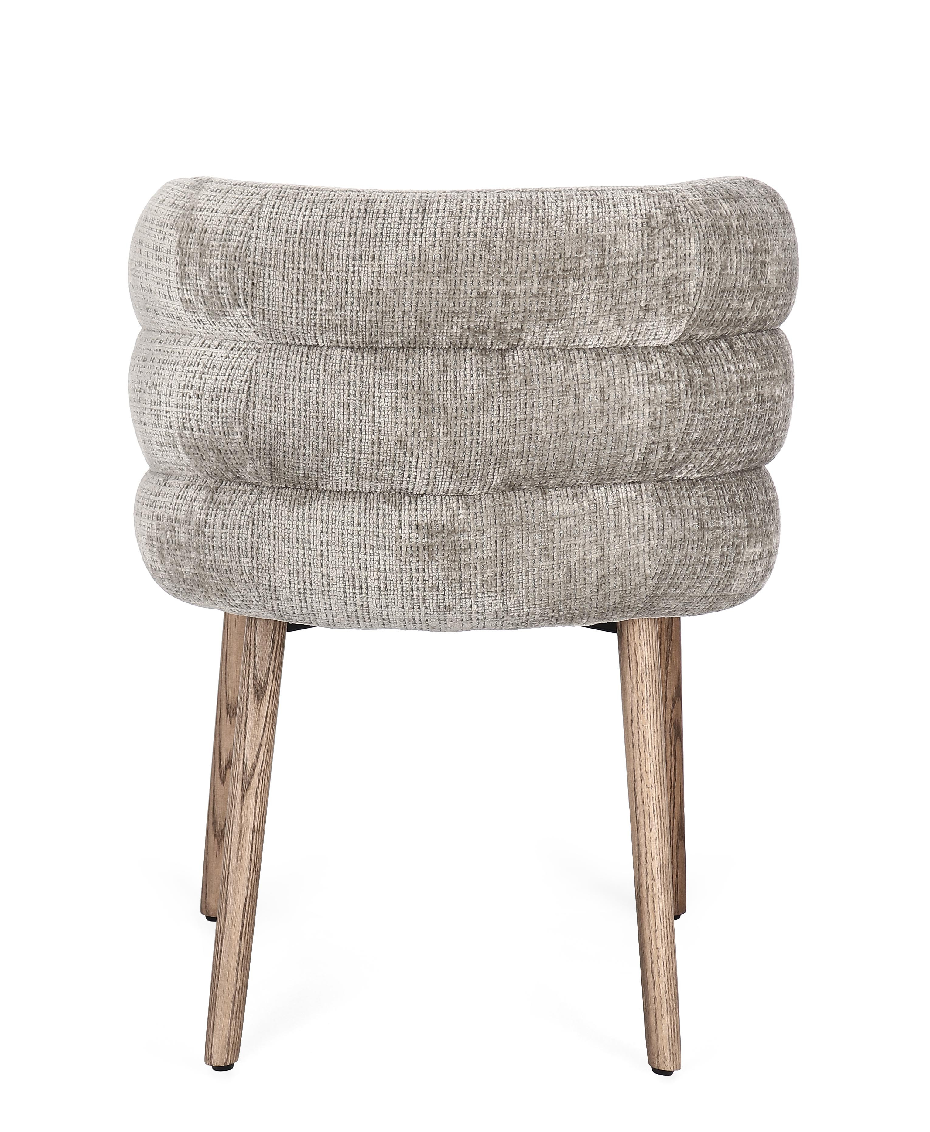 El tapizado en tejido texturizado aporta calidez y carácter, mientras que sus patas de madera maciza estilizan la silueta con un aire natural y atemporal. Una silla pensada para sumar confort y personalidad tanto en un comedor como en un rincón especial del hogar.